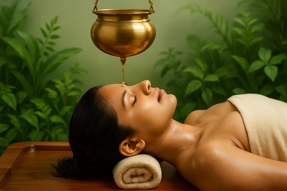 A classical Ayurvedic therapy where a continuous, gentle stream of warm medicated liquid (usually oil, buttermilk, milk, or herbal decoctions) is poured rhythmically over a specific part of the body, most commonly the forehead.