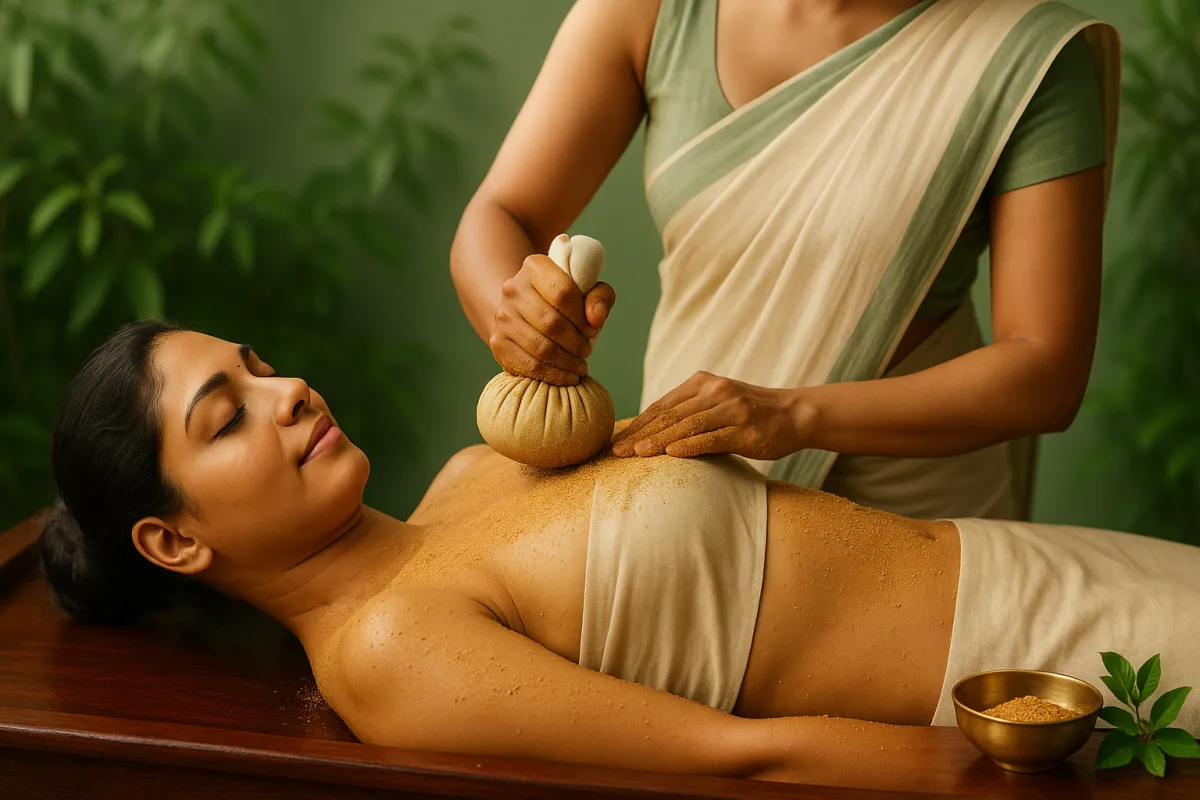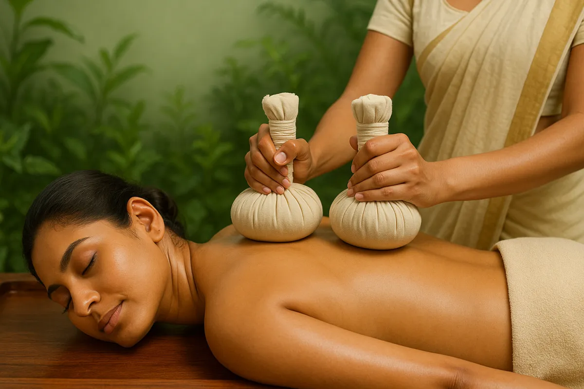 A form of Swedana (sweat-inducing therapy) where heated bundles of herbs, powders, rice, or sand are wrapped in cloth and used to massage the body. These warm pouches are applied after oil massage (Abhyanga) to relieve pain, stiffness, and inflammation.