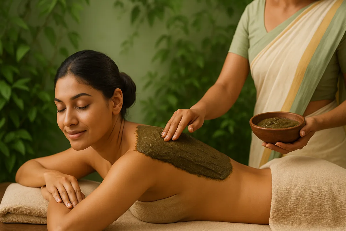Therapeutic application of herbal pastes or powders on the body. It is a common external treatment used to soothe, heal, and balance the doshas.